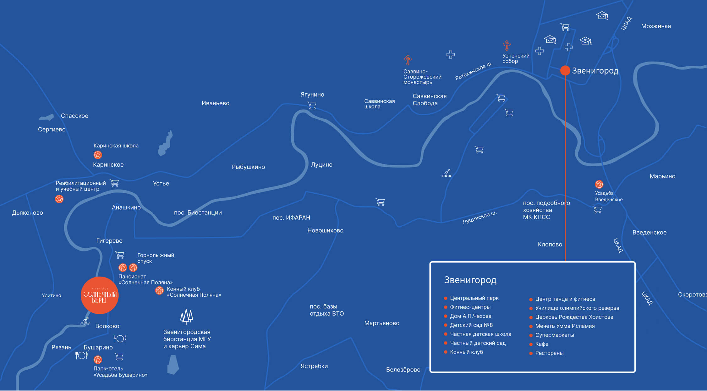 В пределах 40 минут от КП «Солнечный берег» озера, пруды, реки. А в 19,5 км находится Саввино-Сторожевский монастырь, который стоит на третьем месте в России по ежегодному числу паломников после Троице-Сергиевой Лавры и Серафимо-Дивеевской обители.